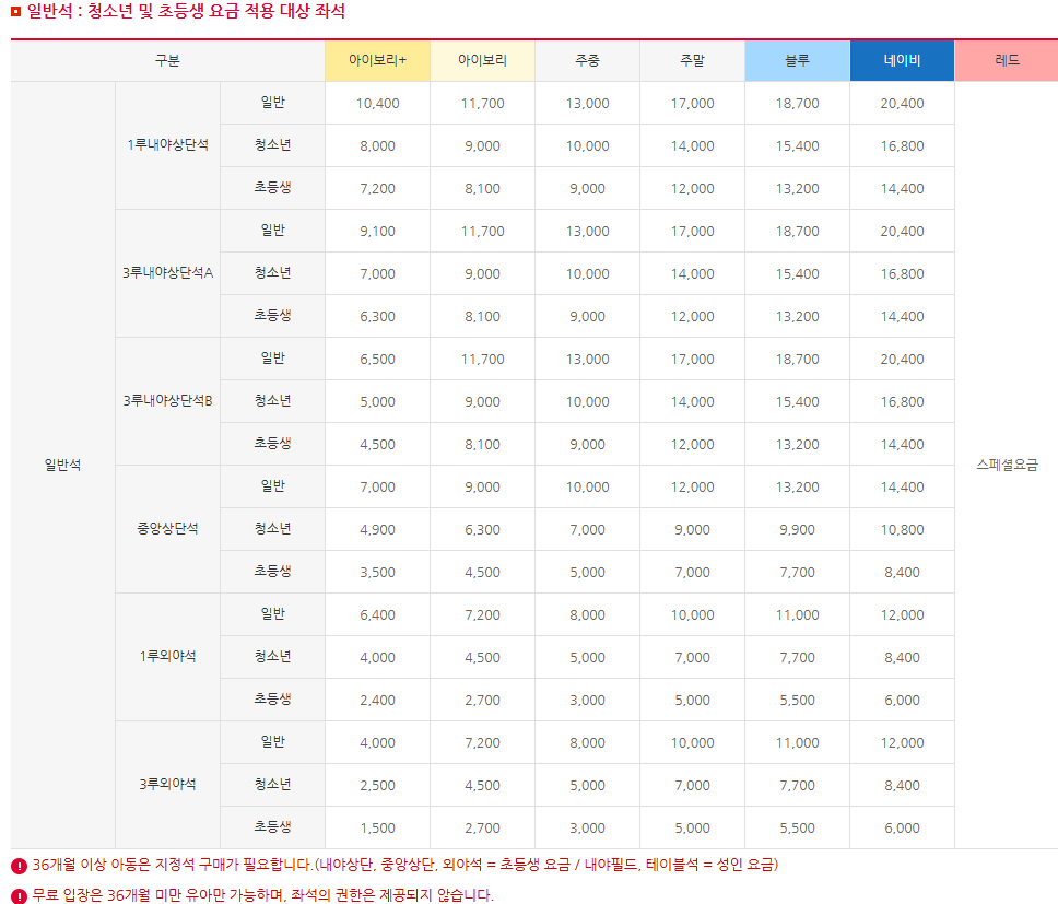 ※ 청소년·초등학생은 일부 좌석에 할인 요금 적용 (예: 내야상단석 주중 청소년 10,000원 / 초등생 9,000원)