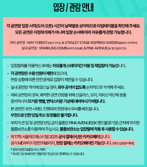 - 타임테이블 체크: 메인무대 외에도 다양한 무대가 분산돼 있으니 사전에 라인업 및 공연 시간을 확인하면 이동이 수월합니다.