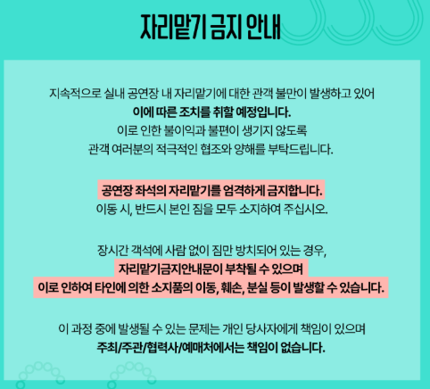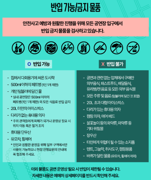 - 돗자리, 종이 의자: 잔디밭에 앉을 때 필수! 단, 다리 있는 캠핑 의자는 시야 방해로 금지입니다.