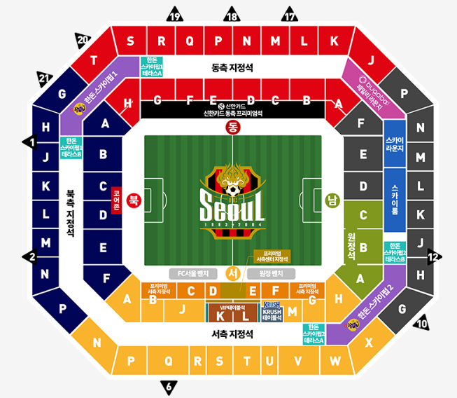 좌석은 동측 지정석, 서측 지정석, 북측/남측 지정석, 프리미엄 좌석 등으로 나뉘며,