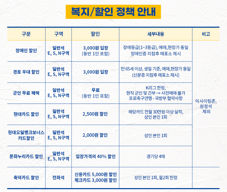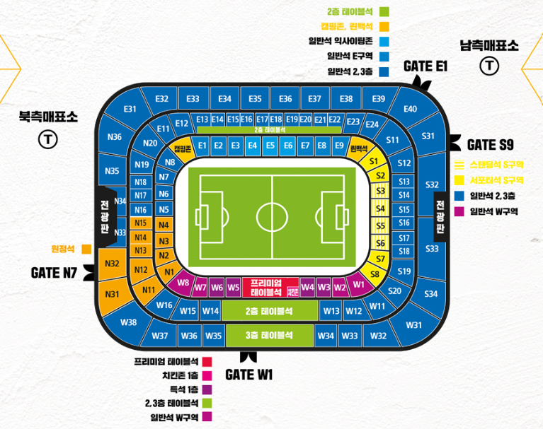 그 외 일반석은 1층 15,000~20,000원, 2~3층 15,000원이며 익사이팅존(E4~6)은 19,000원, 스탠딩석(S3~6)과 원정석(N구역)은 16,000원부터입니다. 빅매치(서울, 전북, 포항 등)나 결승전은 2,000~4,000원 추가됩니다.
