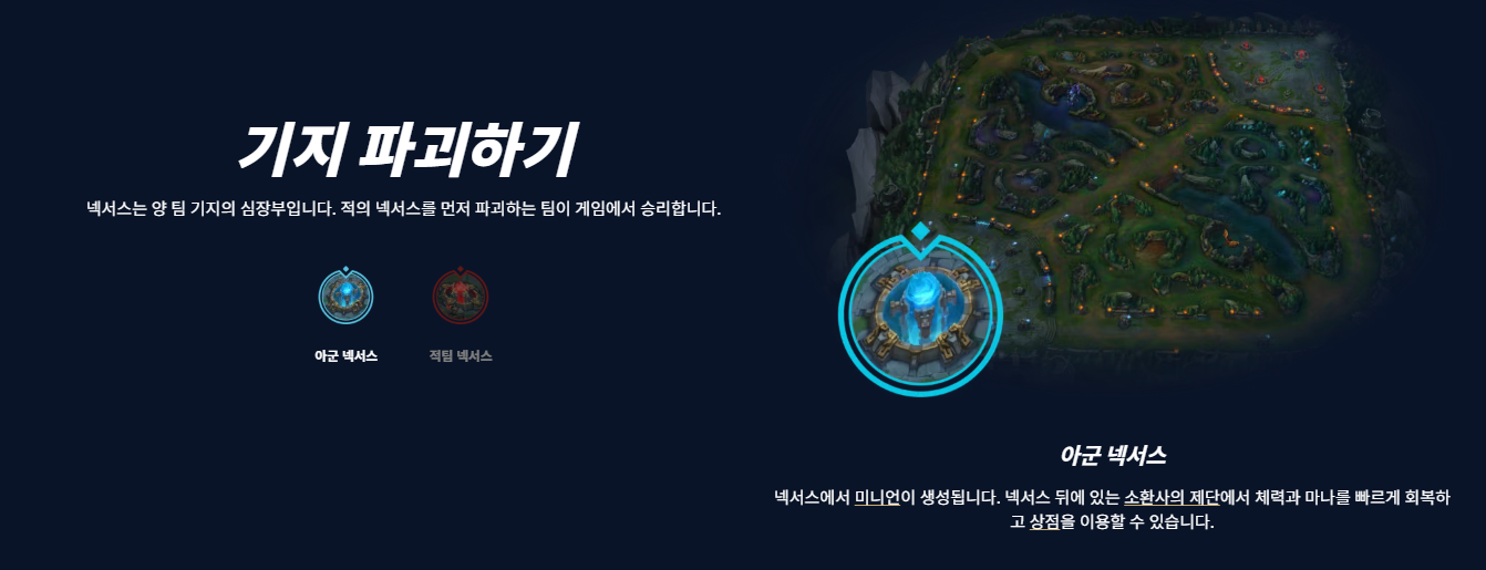 • 게임의 최종 목표는 상대 넥서스를 파괴하는 것입니다.